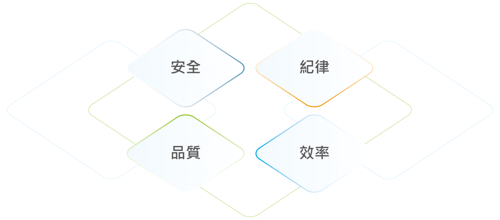 在“安全第一”置於首位之基礎上,本公司將“嚴守紀律”和“保證品質”作為公司之基本精神開展至各工作。以第一次就把對的事情做好來“提升效率”,以此為全公司員工之最基本準則。